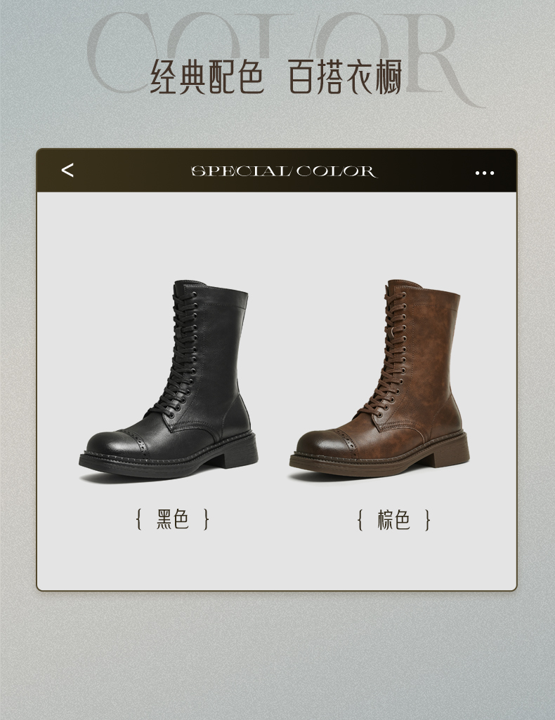 | 鞋底材质:橡胶底 | 靴筒内里材质:猪皮革织物面料 | 内增高:无 | 鞋面材质:人造革 | 闭合方式:系带 |
