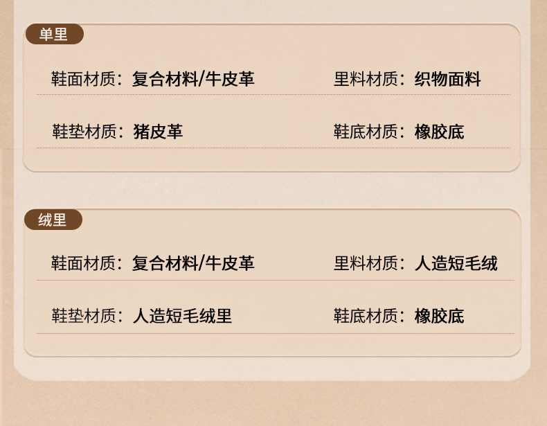 | 靴筒筒面材质:复合材料牛皮革 | 靴筒小腿围:32CM | 里料材质:织物面料 | 制鞋工艺:胶贴皮鞋 | 鞋垫材质:猪皮革 |
