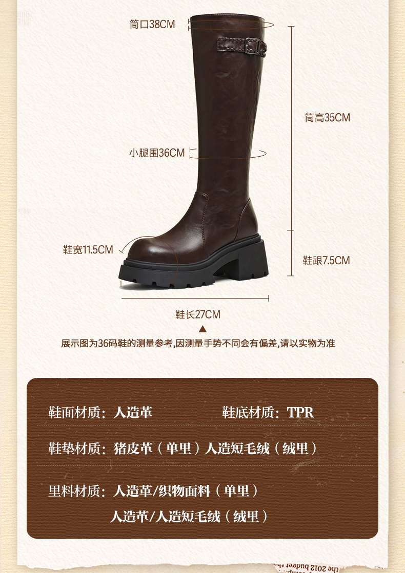 | 靴筒筒面材质:人造革 | 靴筒小腿围:36CM | 里料材质:织物面料人造革 | 制鞋工艺:胶贴皮鞋 | 鞋垫材质:猪皮革 |