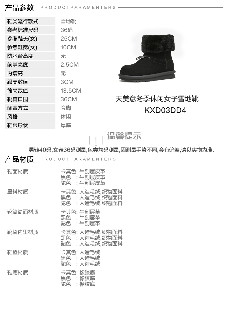 | 功能科技:耐磨 | 鞋底材质:橡胶底 | 靴筒内里材质:织物面料人造毛绒 | 内增高:无 | 鞋面材质:牛剖层皮革 |