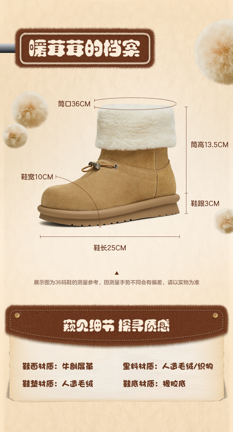 | 帮面材质:牛剖层革 | 靴筒口围:36CM | 风格分类:雪地靴 | 上市时间:2024年冬季 | 鞋类流行款式:雪地靴 |