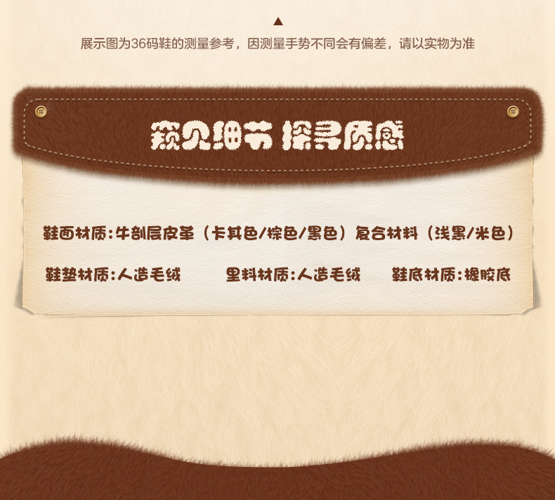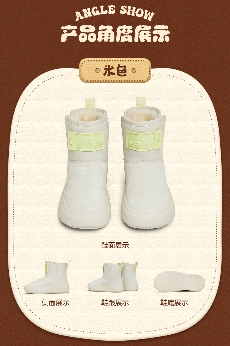 | 靴筒筒面材质:牛剖层革 | 里料材质:人造毛绒 | 制鞋工艺:胶贴皮鞋 | 款式季节:冬季 | 鞋垫材质:人造毛绒 |