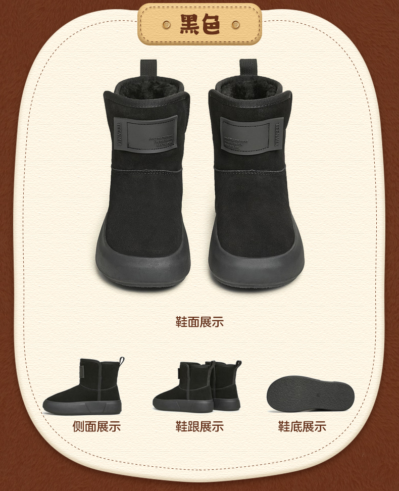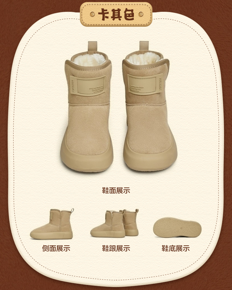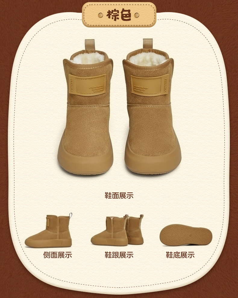 | 功能科技:防滑无 | 鞋底材质:橡胶底 | 靴筒内里材质:人造毛绒 | 内增高:无 | 鞋面材质:牛剖层革牛剖层皮革 |