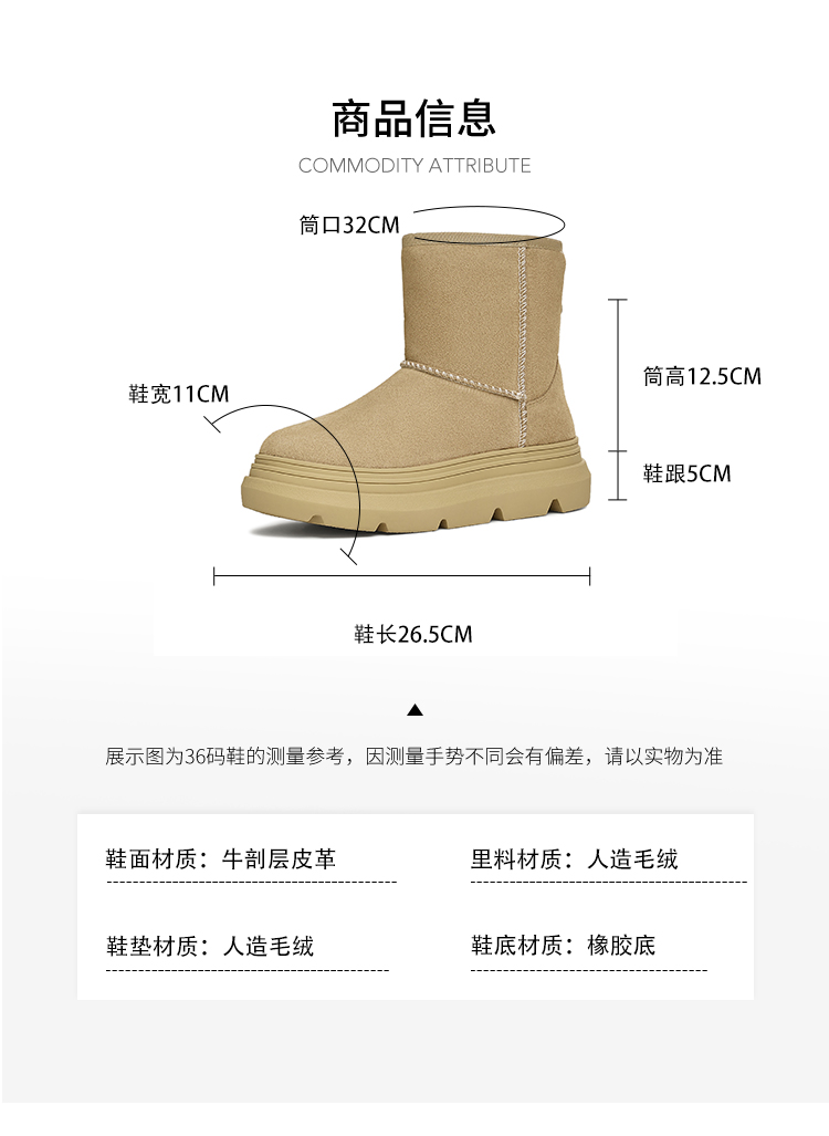 | 帮面材质:牛剖层革 | 靴筒口围:32CM | 风格分类:雪地靴 | 上市时间:2024年冬季 | 鞋类流行款式:雪地靴 |