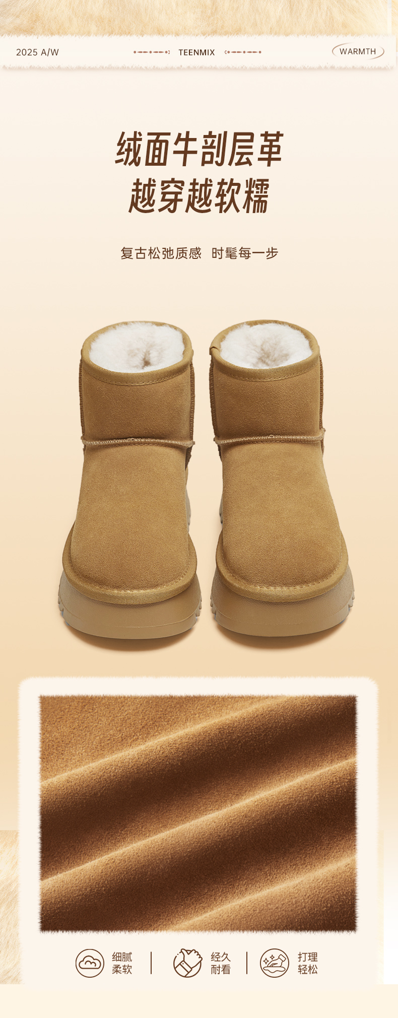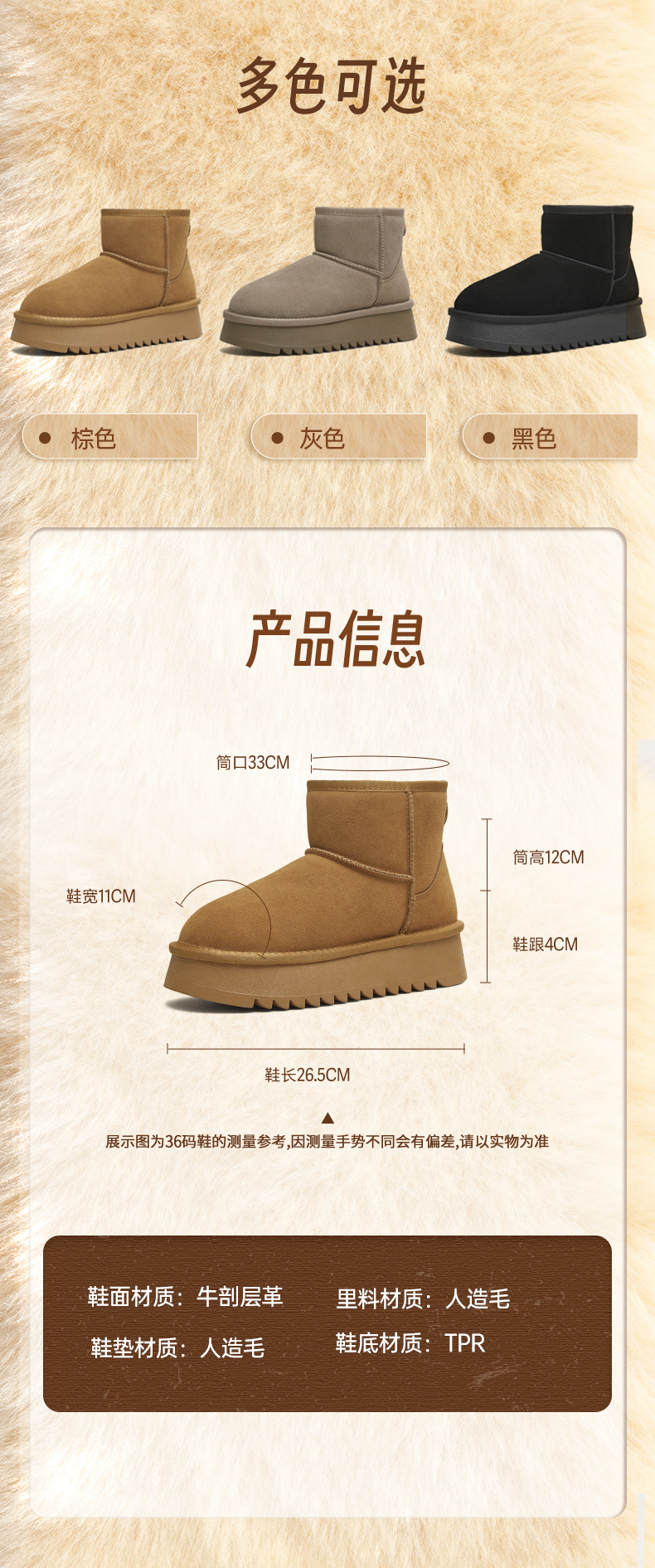 | 帮面材质:牛剖层革 | 配跟:无 | 靴筒口围:34CM | 上市时间:2025年冬季 | 鞋类流行款式:雪地靴 |