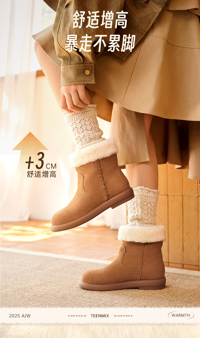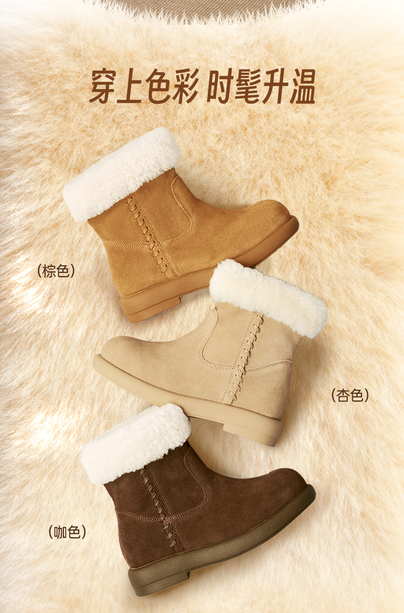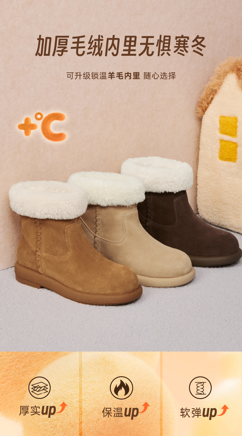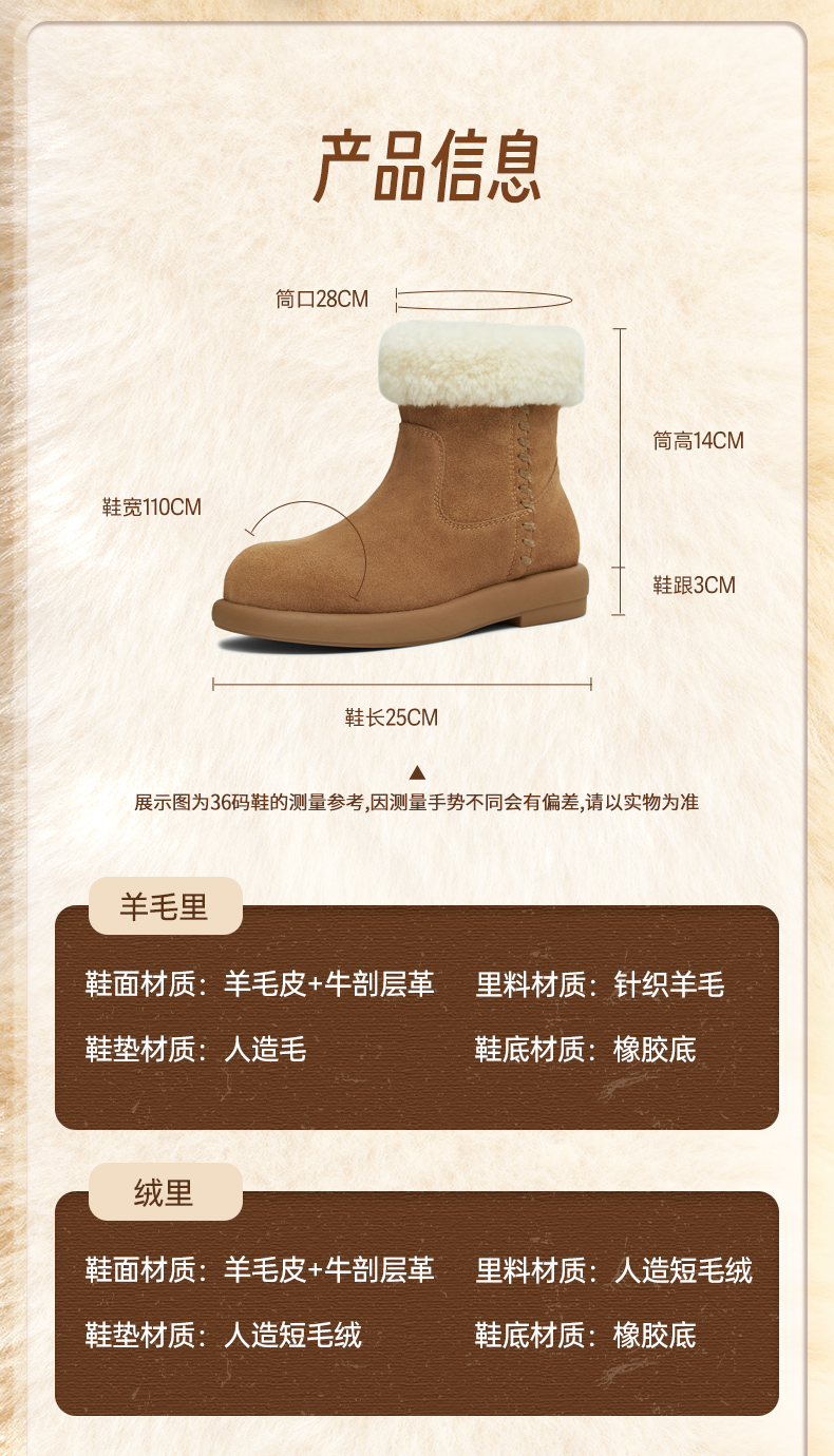| 帮面材质:羊毛皮牛剖层革 | 配跟:无 | 靴筒口围:28CM | 上市时间:2025年冬季 | 鞋类流行款式:雪地靴 |