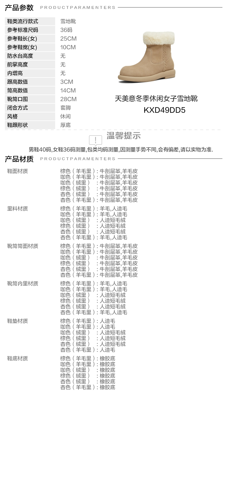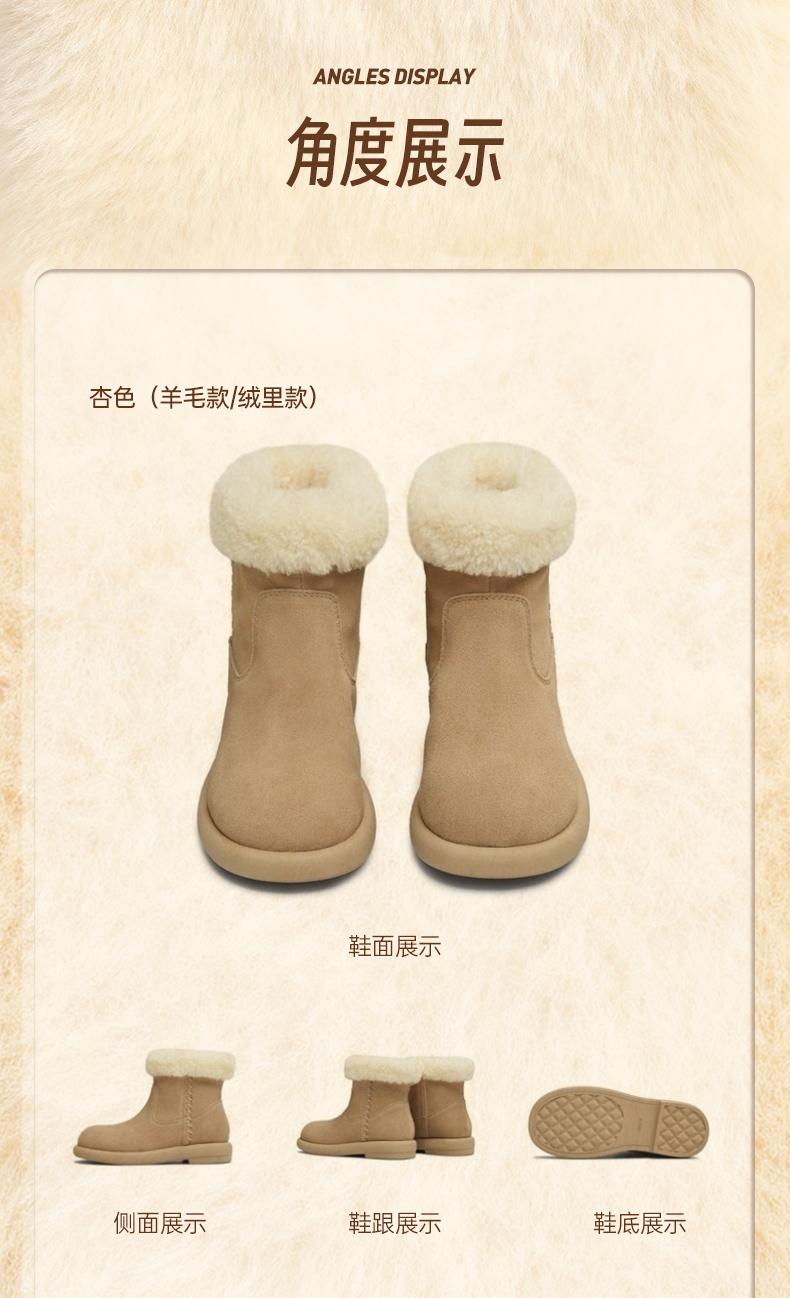 | 筒高数值:14CM | 靴筒筒面材质:羊毛皮牛剖层革 | 里料材质:人造短毛绒 | 制鞋工艺:胶贴皮鞋 | 鞋垫材质:人造短毛绒 |