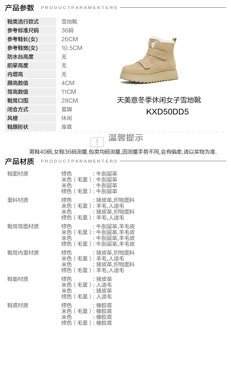 | 筒高数值:11CM | 靴筒筒面材质:羊毛皮牛剖层革 | 里料材质:人造毛羊毛 | 制鞋工艺:胶贴皮鞋 | 鞋垫材质:人造毛 |