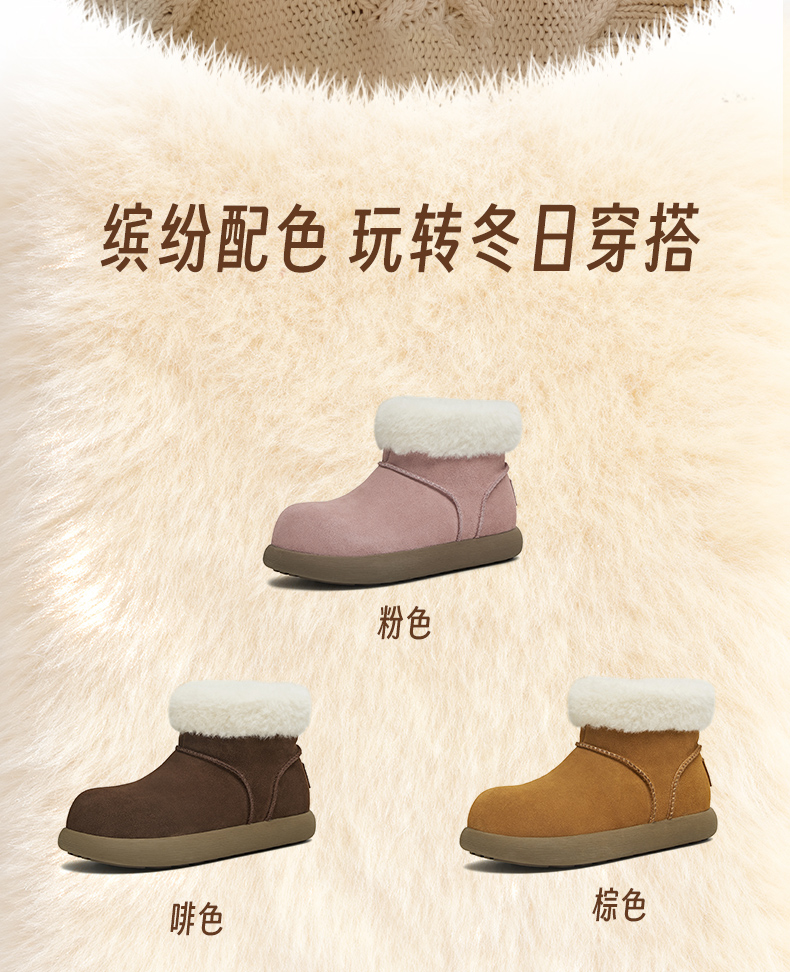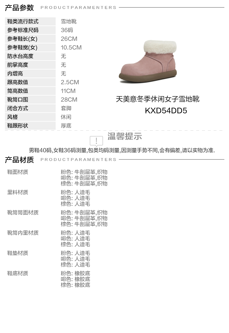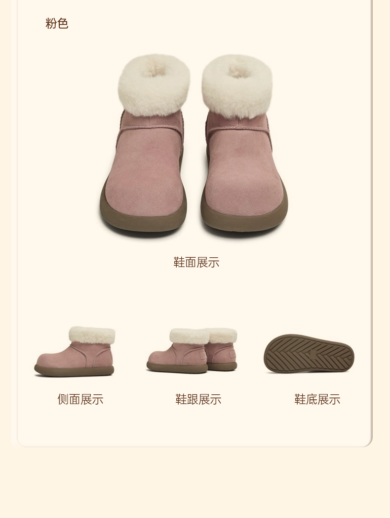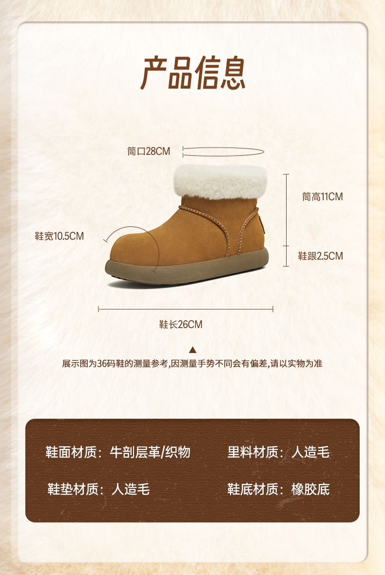 | 帮面材质:织物牛剖层革 | 配跟:无 | 靴筒口围:28CM | 上市时间:2025年冬季 | 鞋类流行款式:雪地靴 |