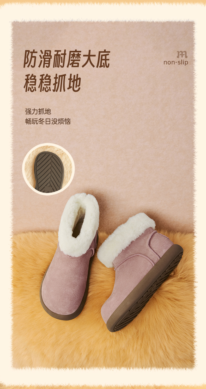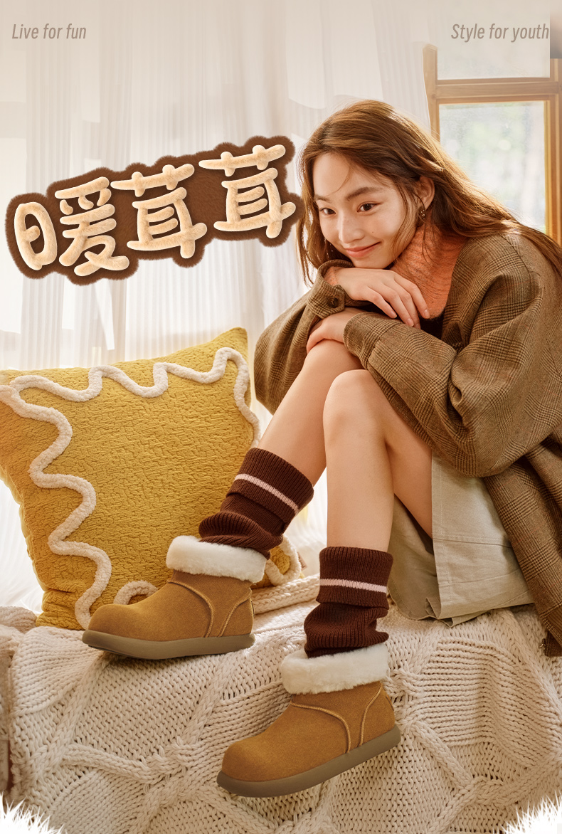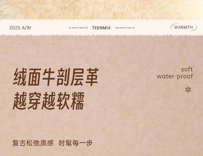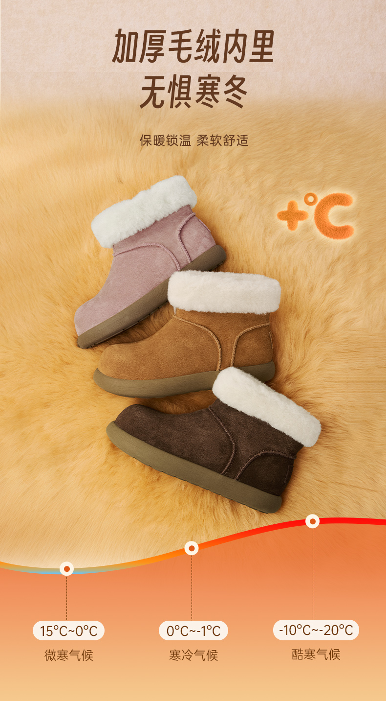 | 帮面材质:织物牛剖层革 | 配跟:无 | 靴筒口围:28CM | 上市时间:2025年冬季 | 鞋类流行款式:雪地靴 |