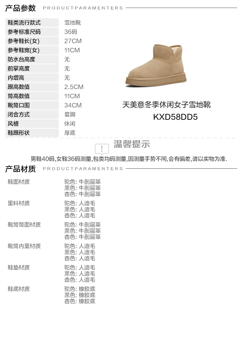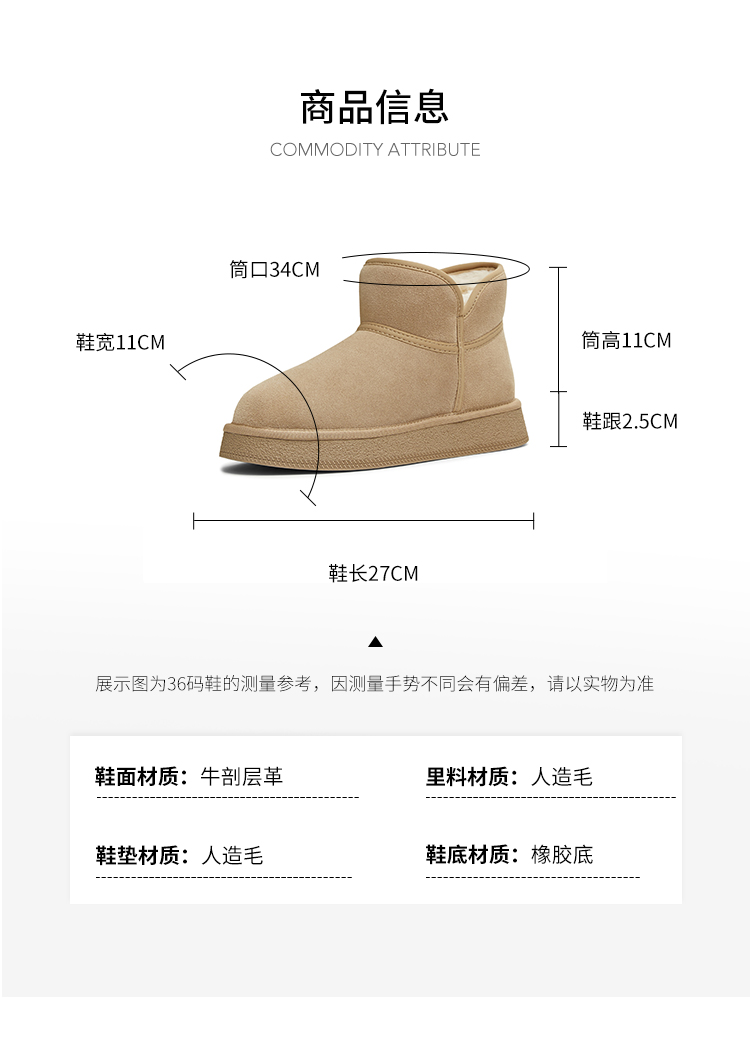| 帮面材质:牛剖层革 | 配跟:无 | 靴筒口围:34CM | 上市时间:2025年冬季 | 鞋类流行款式:雪地靴 |