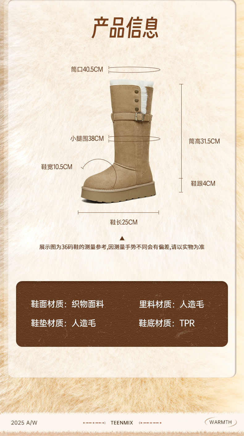 | 配跟:无 | 靴筒口围:40.5CM | 上市时间:2025年冬季 | 鞋类流行款式:时装靴 | 鞋头款式:圆头 |