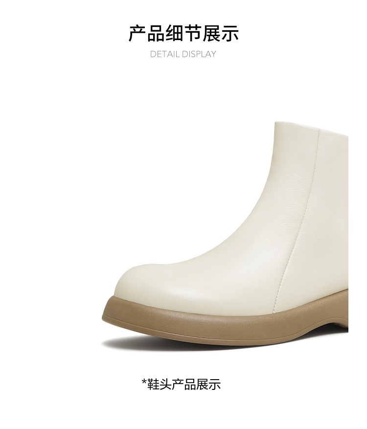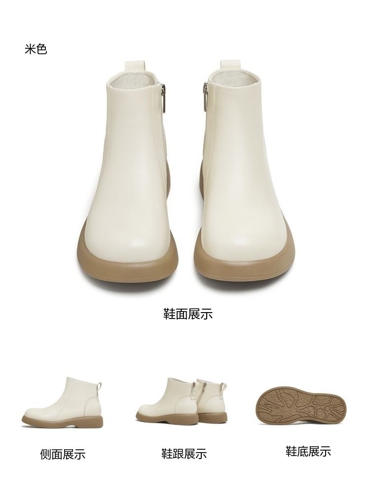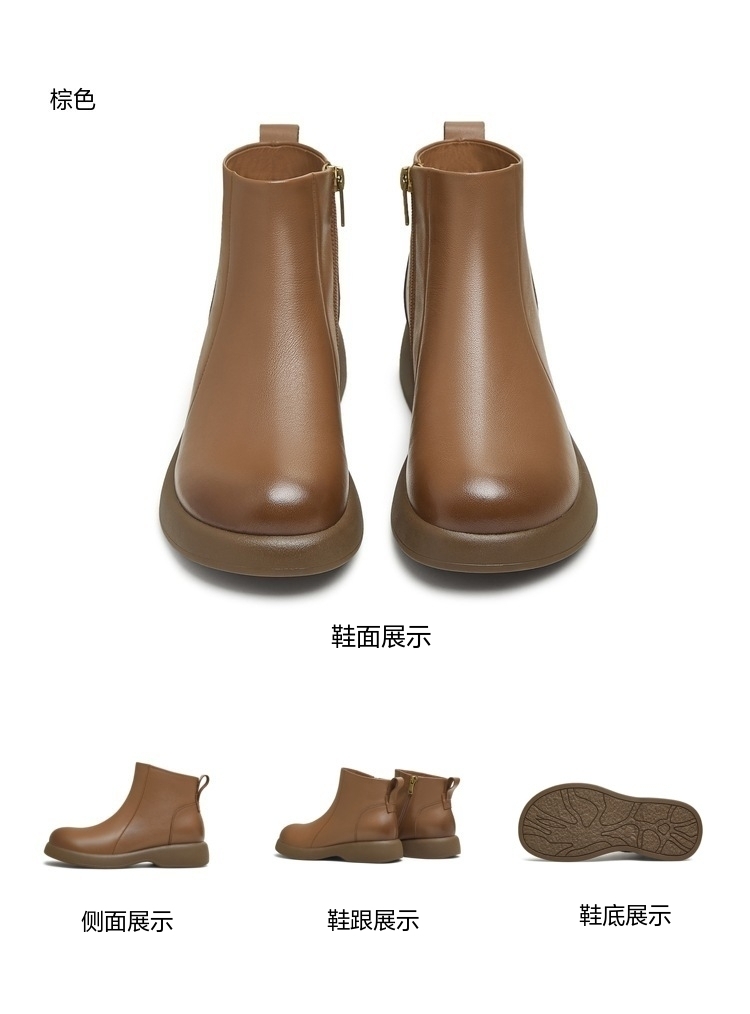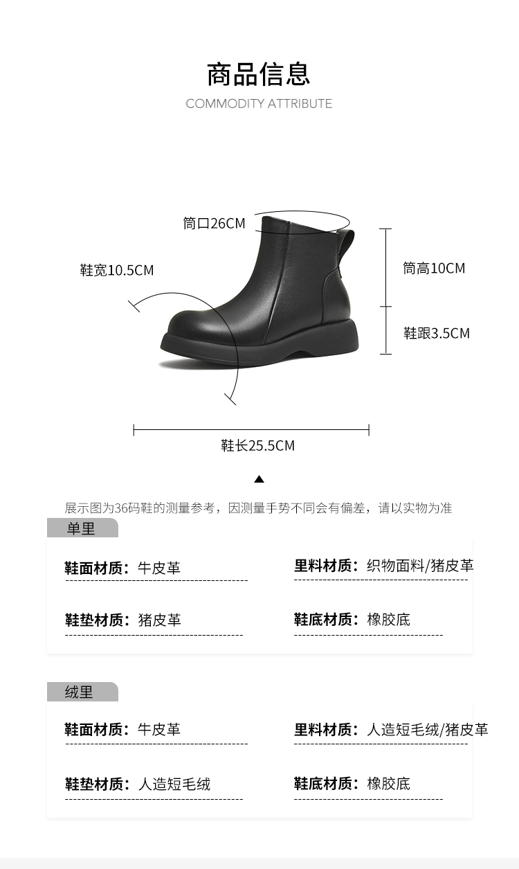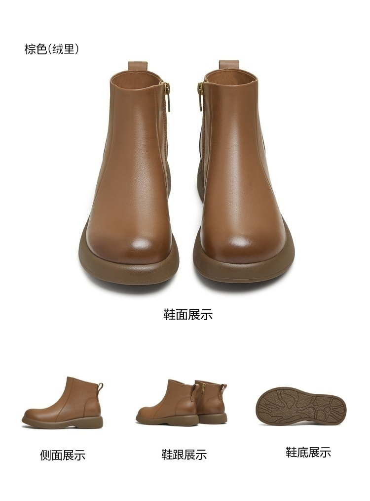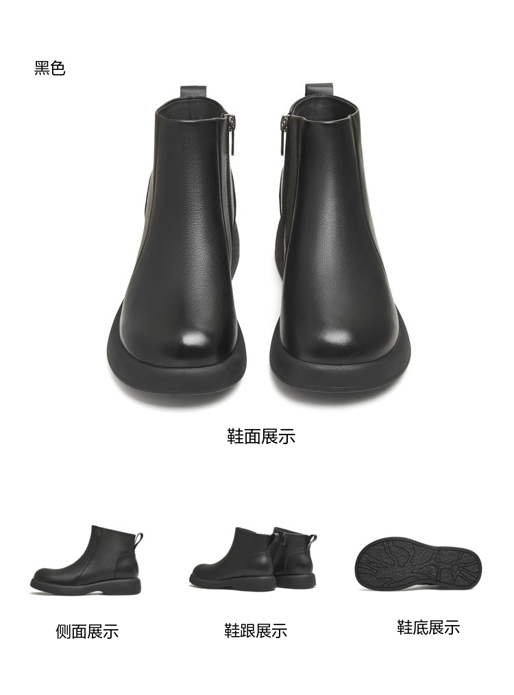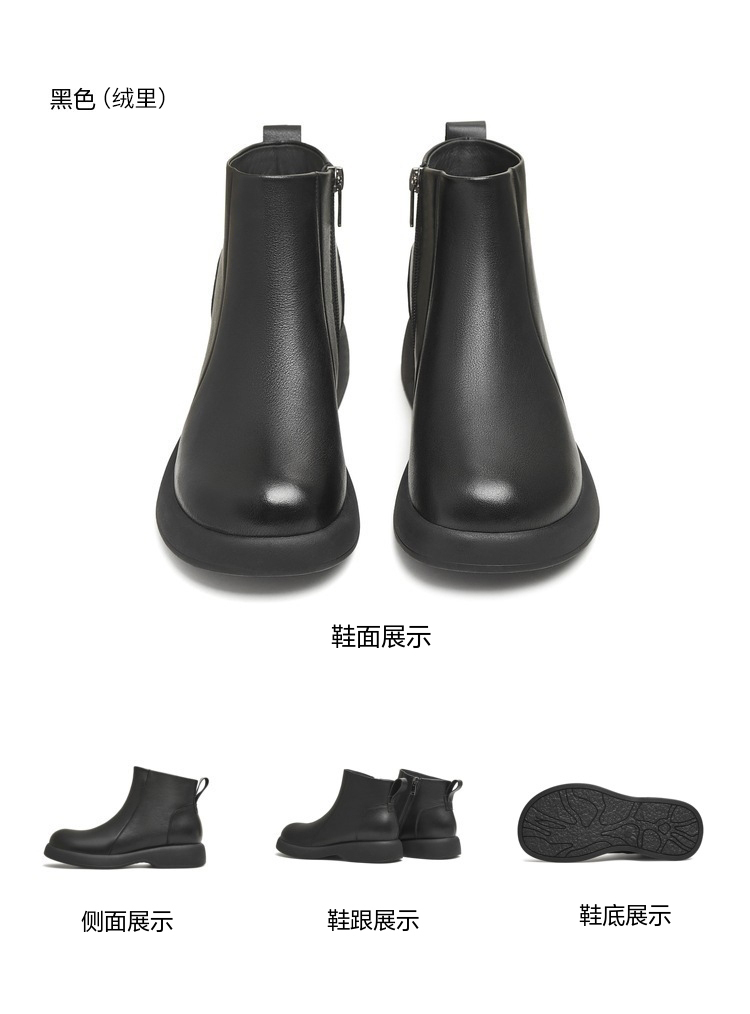 | 鞋底材质:橡胶底 | 靴筒内里材质:猪皮革织物面料 | 内增高:无 | 鞋面材质:牛皮革 | 闭合方式:侧拉链 |