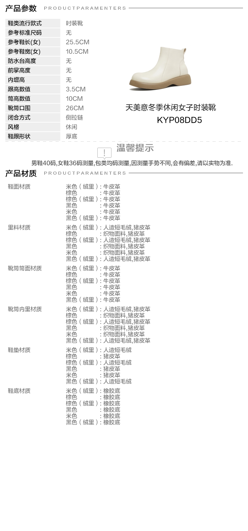 | 参考鞋宽(女):10.5CM | 风格:休闲 | 色系:米色 | 跟高数值:3.5CM | 性别:女子 |