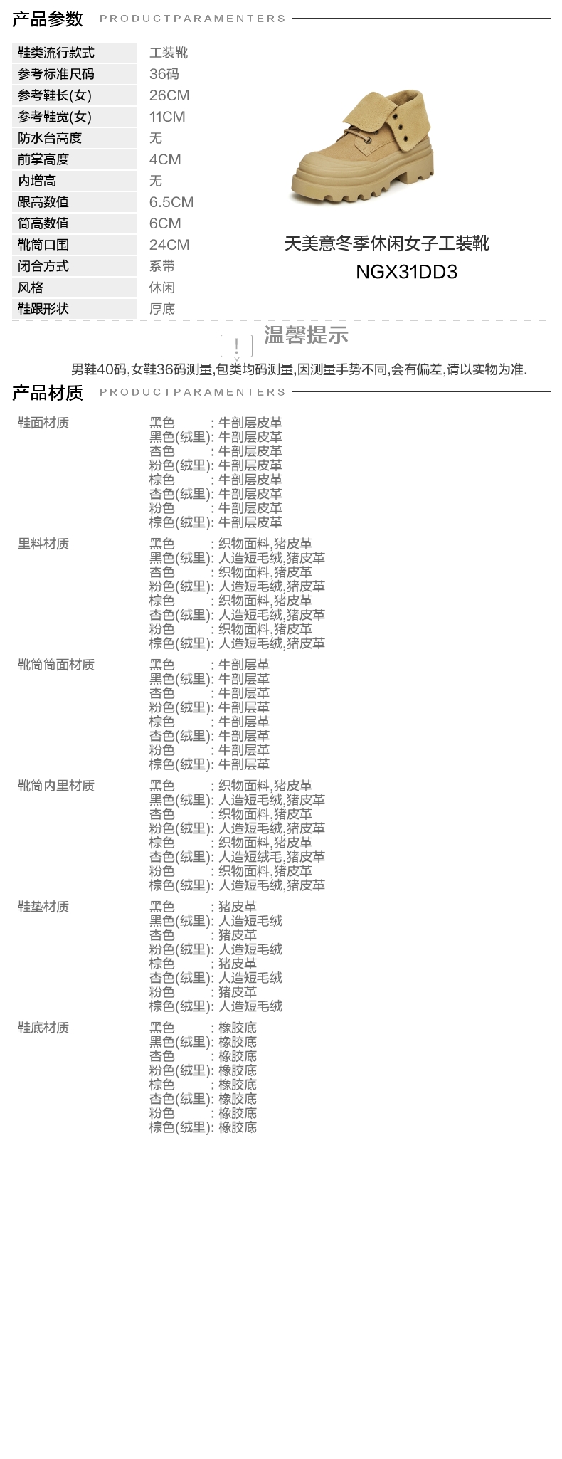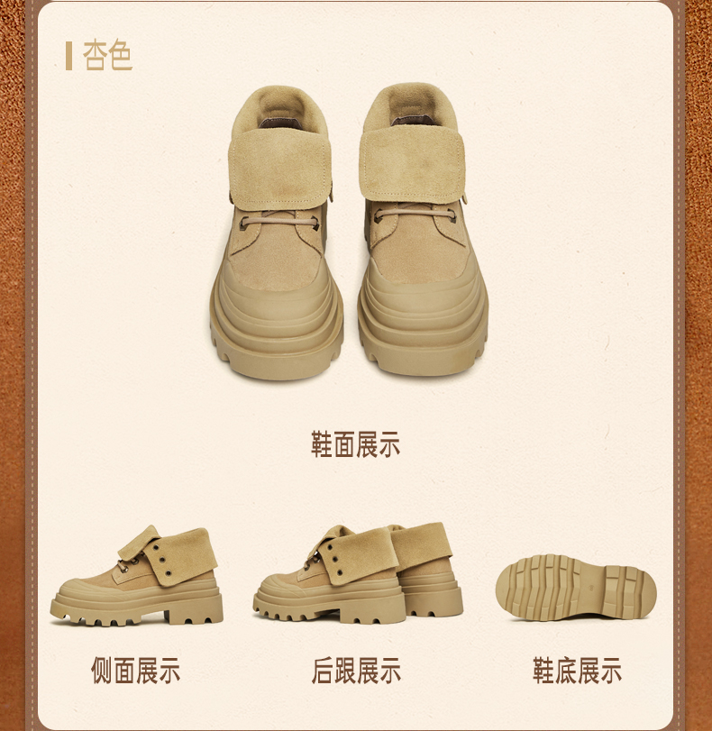 | 参考鞋宽(女):11CM | 风格:休闲 | 色系:杏色 | 跟高数值:6.5CM5CM | 筒高数值:6CM |