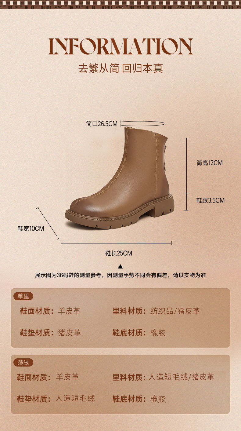 | 鞋底材质:橡胶底橡胶底 | 靴筒内里材质:猪皮革猪皮革织物面料绒布 | 内增高:无无 | 鞋面材质:羊皮革羊皮革 | 闭合方式:后拉链后拉链 |
