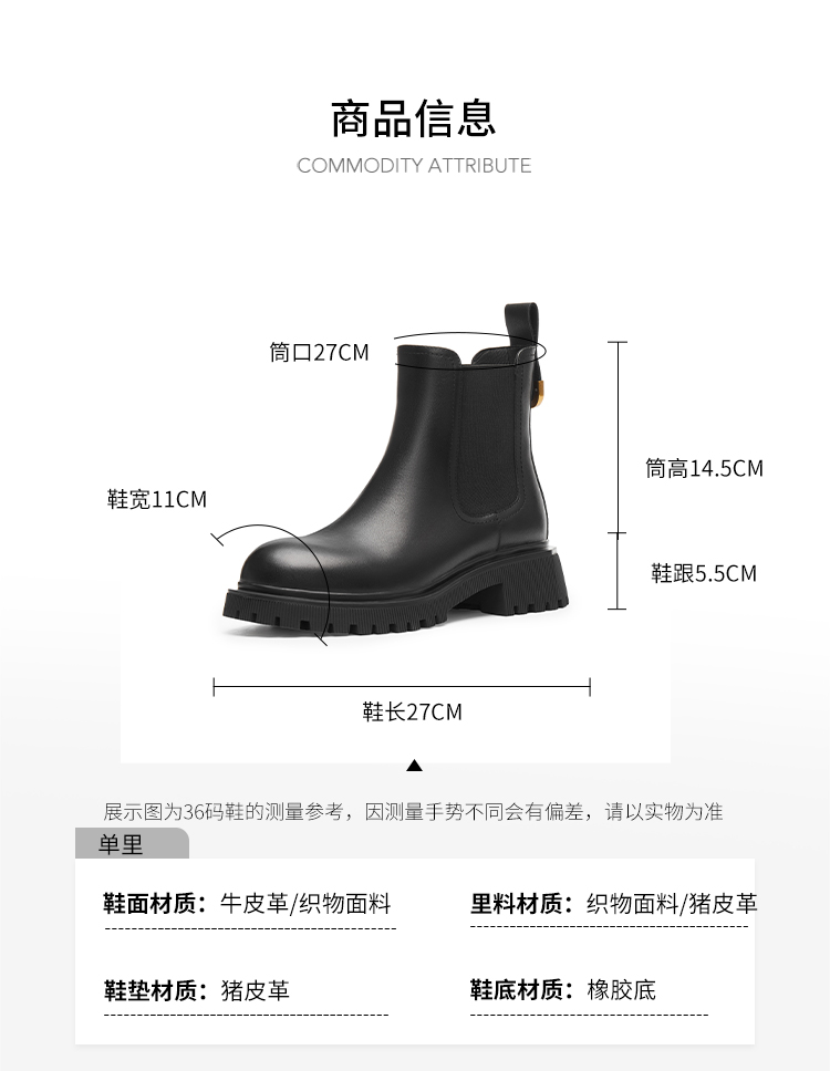 | 靴筒口围:27CM | 风格分类:切尔西靴 | 上市时间:2023年冬季 | 鞋类流行款式:切尔西靴 | 鞋头款式:圆头 |