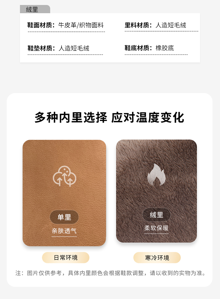 | 鞋底材质:橡胶底 | 靴筒内里材质:织物面料猪皮革 | 内增高:无 | 鞋面材质:织物面料牛皮革 | 适用场合:日常休闲 |