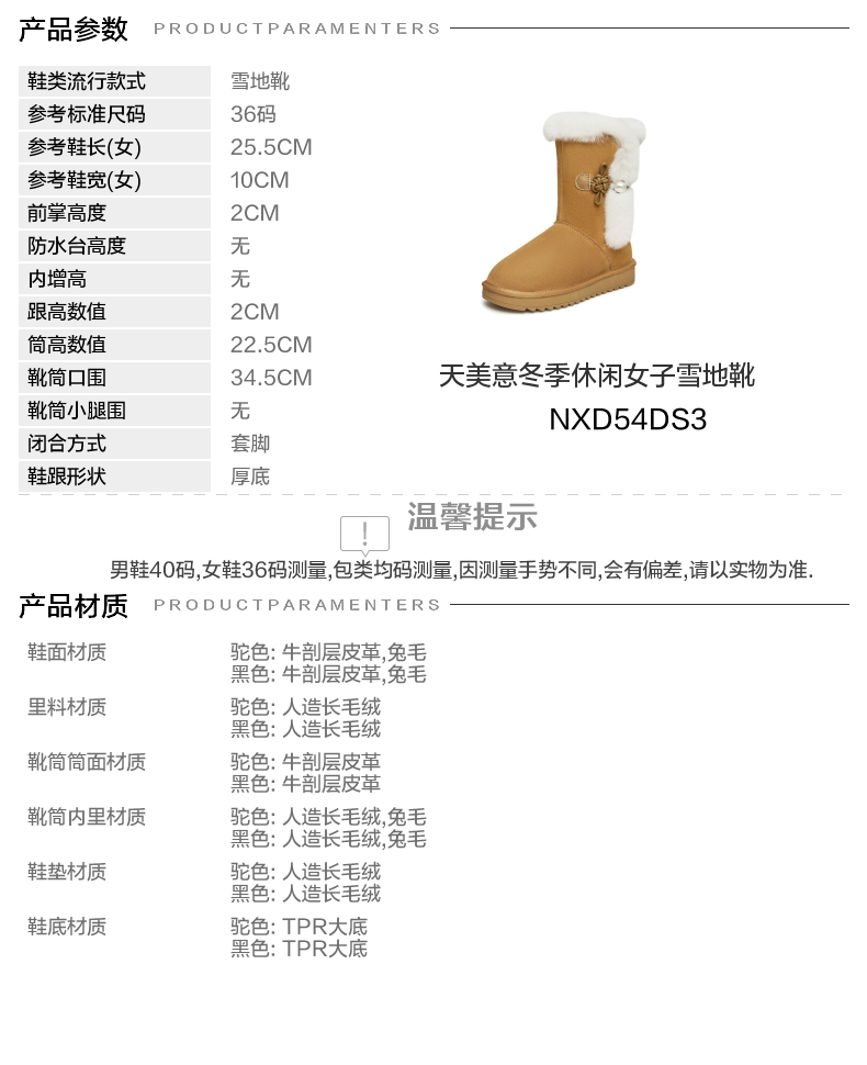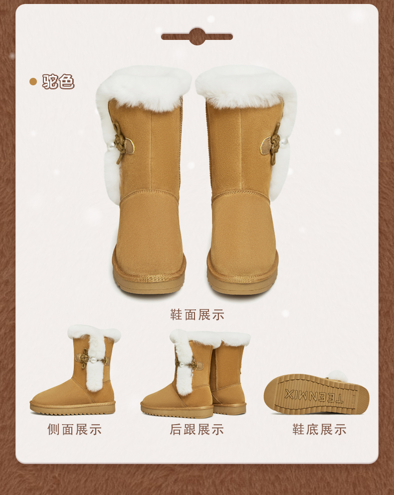 | 靴筒筒面材质:牛剖层皮革 | 里料材质:人造长毛绒 | 制鞋工艺:胶贴皮鞋 | 鞋垫材质:人造长毛绒 | 款式季节:冬季 |