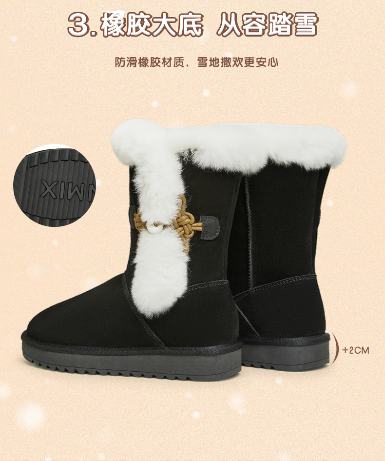 | 鞋底材质:TPR大底 | 靴筒内里材质:人造长毛绒 | 内增高:无 | 鞋面材质:兔毛牛剖层皮革 | 闭合方式:套脚 |