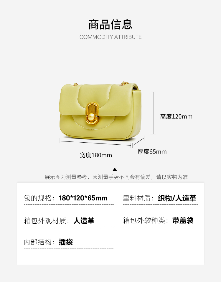 | 包的规格:W180*H120*D65mm | 内部结构:插袋 | 闭合方式:锁扣 | 背带方式:单肩/斜挎 | 风格:时尚休闲 |