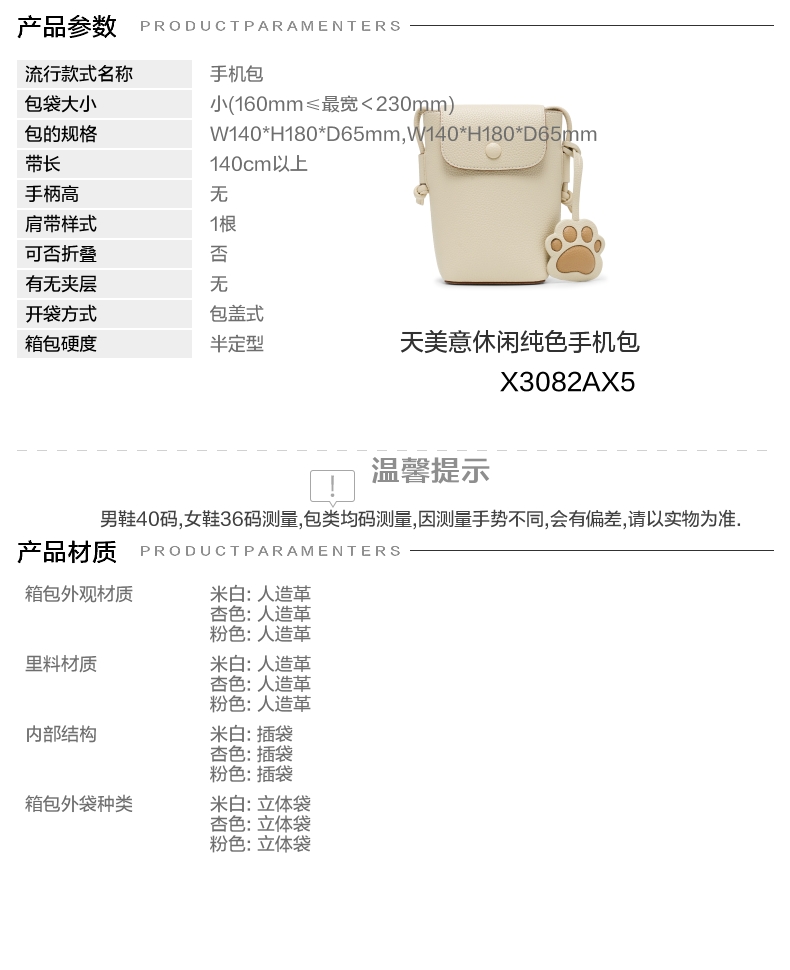 | 款式季节:春季 | 材质工艺:PU | 皮质特征:人造革 | 箱包硬度:半定型 | 箱包外观材质:人造革 |
