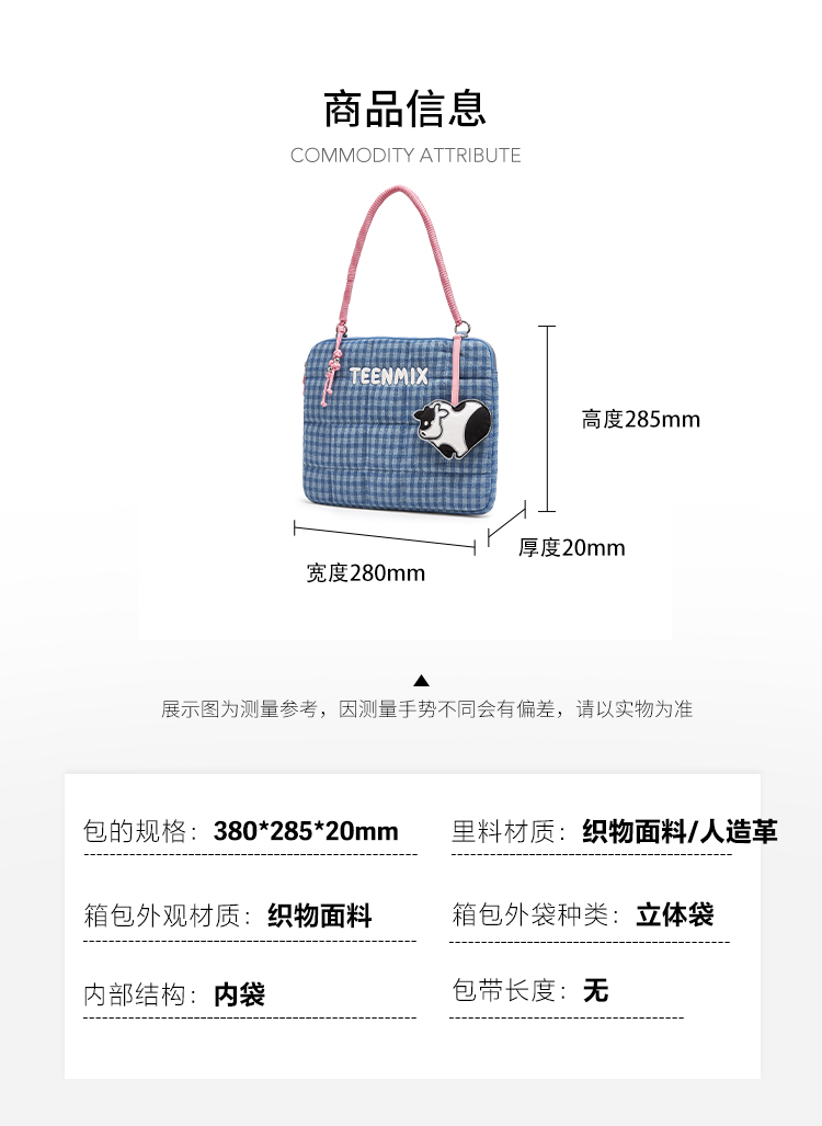 | 包的规格:380*285*20(mm) | 内部结构:内袋 | 背带方式:手提 | 风格:休闲 | 色系:蓝色 |