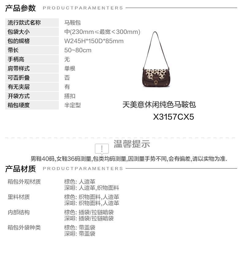 | 色系:咖啡色 | 适用场景:休闲 | 开袋方式:搭扣 | 性别:女子 | 是否防水:否 |