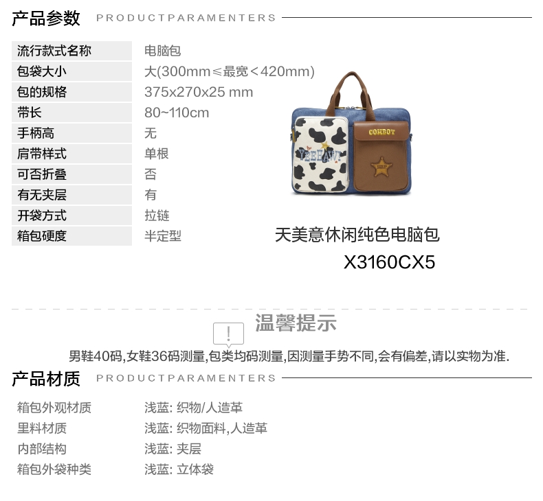| 款式季节:秋季 | 材质工艺:织物 | 皮质特征:人造革 | 箱包硬度:半定型 | 箱包外观材质:织物/人造革 |