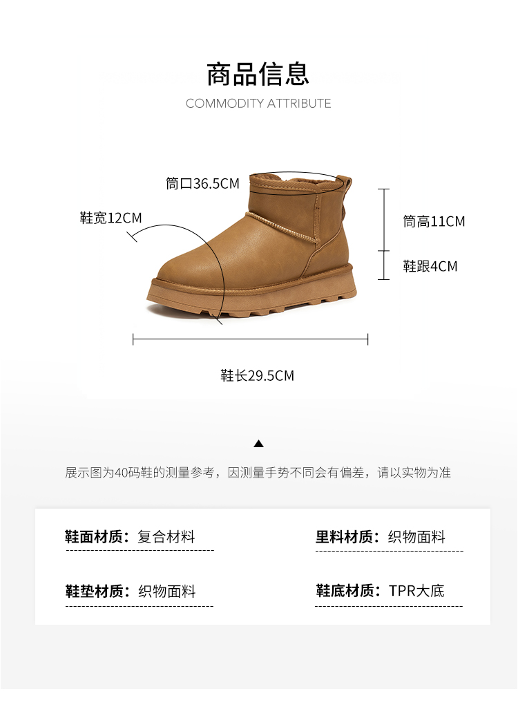| 闭合方式:套脚 | 40码鞋宽参考(男):12CM | 靴筒口围:36.5CM | 上市时间:2025年冬季 | 鞋类流行款式:雪地靴 |