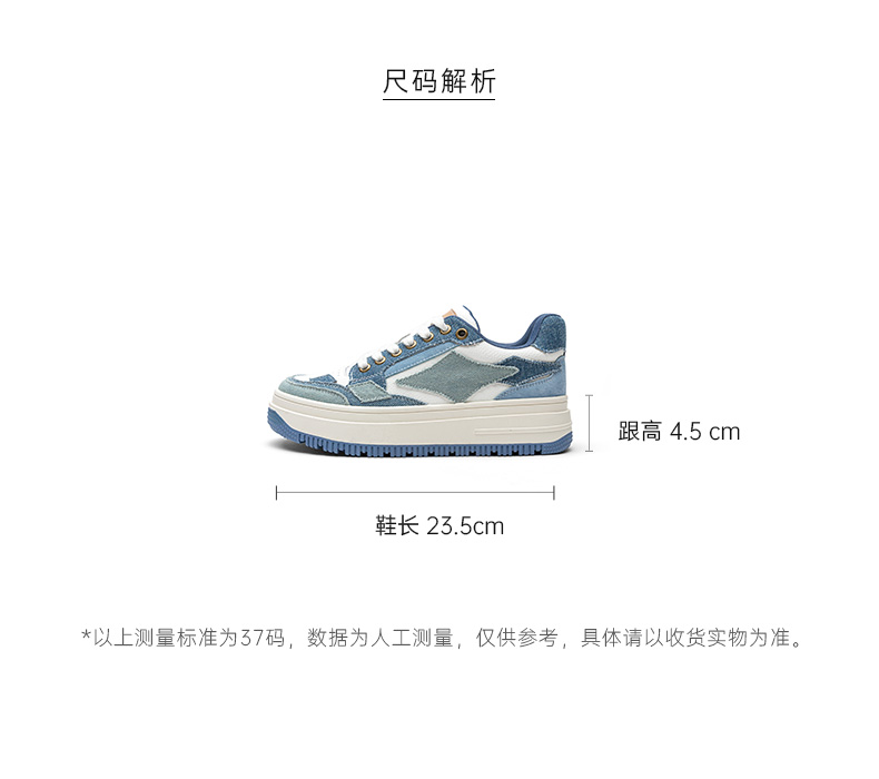 | 鞋跟形状:厚底 | 鞋面材质:织物面料合成革 | 流行元素:皮配布 | 参考鞋长(女):23CM | 参考鞋宽(女):7.5CM |