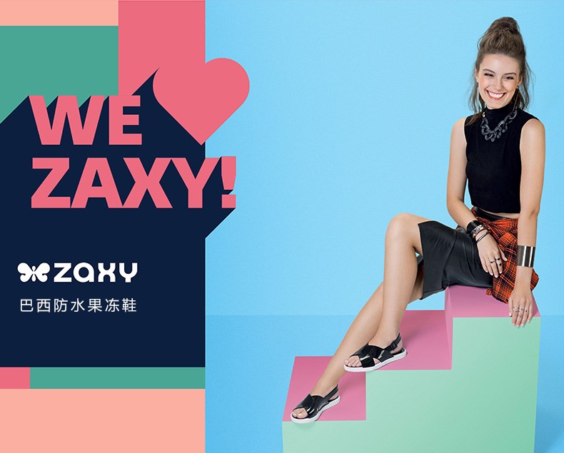 zaxy是巴西GRENDENE集团旗下的少女果冻鞋品牌,由人气果冻鞋品牌Melissa变奏而成,具有巴西色彩的奔放和热情,致力于让每位活力少女都找到属于自己的鞋履。先天具备色彩、快乐、自由、舒适四大特点,诠释了新时代少女的时尚美学。zaxy用色上明亮鲜艳,重组高饱和度糖果色彩,玩味拼色,让你找到你的专有色。鞋面标志的立体蝴蝶结,细致印花,3D配饰等元素,各个细节都洋溢着对时尚的澎湃热情,象征着zaxy自由无束的品牌精神。